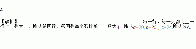 A 【解析】每一行,每一列都比上一行上一列大一,所以第四行,第四列每个数比前一个数大4,所以a=20, b=25,c=24.所以选A.
