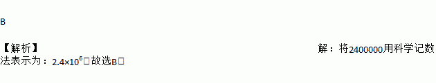 B 【解析】【解析】 将2400000用科学记数法表示为:2.4×106.故选B.