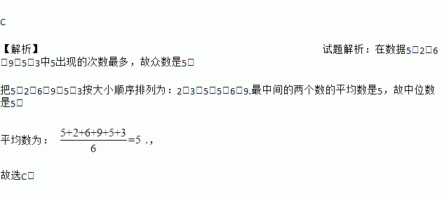 C 【解析】试题解析:在数据5,2,6,9,5,3中5出现的次数最多,故众数是5; 把5,2,6,9,5,3按大小顺序排列为:2,3,5,5,6,9.最中间的两个数的平均数是5,故中位数是5; 平均数为: ., 故选C.