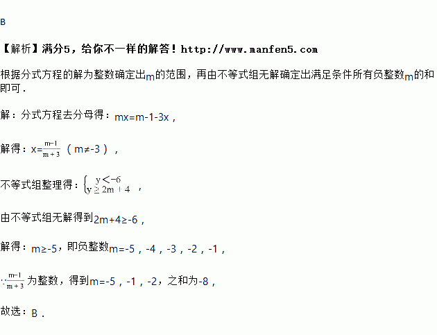 如果关于的分式方程的解为整数,且关于的不等式组无解,则符合条件的所有负整数的和为( )