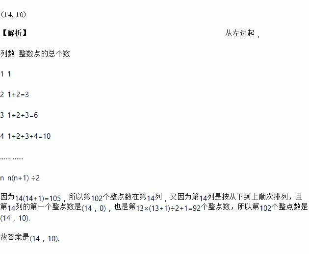 如图所示,在平面直角坐标系中,有若干个整数点,其顺序按图中箭头方向排列,如(1,0),(2,0)(2,1),(3,2),(3,1)(3,0),……,根据这个规律探索可得,第102个点的坐标为______________;