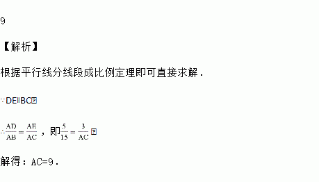 如图,D,E分别为△ABC边AB,AC上的点,且DE∥BC,若AD=5,AB=15,AE=3,求AC的长.