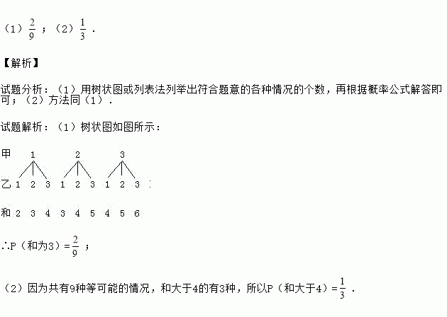 £¨1£©£»£¨2£©£® ¡¾½âÎö¡¿ ÊÔÌâ·ÖÎö£º£¨1£©ÓÃÊ÷״ͼ»òÁÐ±í·¨Áоٳö·ûºÏÌâÒâµÄ¸÷ÖÖÇé¿öµÄ¸öÊý£¬ÔÙ¸ù¾Ý¸ÅÂʹ«Ê½½â´ð¼´¿É£»£¨2£©·½·¨Í¬£¨1£©£® ÊÔÌâ½âÎö£º£¨1£©Ê÷״ͼÈçͼËùʾ£º ¡àP£¨ºÍΪ3£©=£» £¨2£©ÒòΪ¹²ÓÐ9ÖֵȿÉÄܵÄÇé¿ö£¬ºÍ´óÓÚ4µÄÓÐ3ÖÖ£¬ËùÒÔP£¨ºÍ´óÓÚ4£©=£®