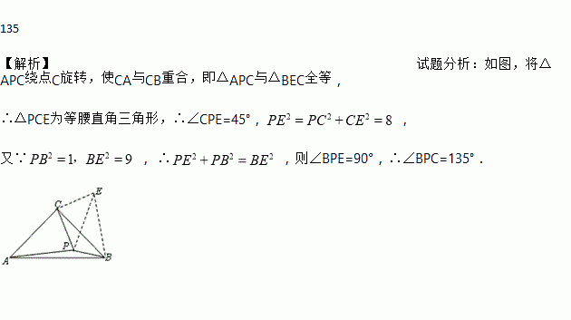 如图,在△ABC中,∠ACB=90°,AC=BC,点P是△ABC内的一点,且PB=1,PC=2,PA=3,则∠BPC=_____°。