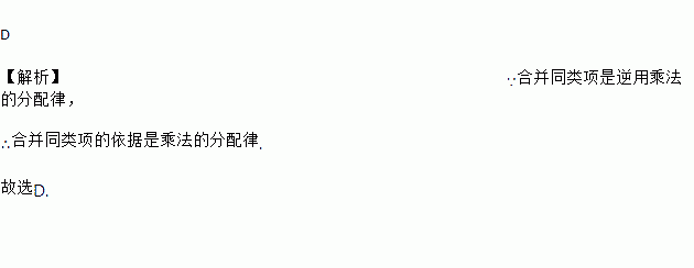 D 【解析】∵合并同类项是逆用乘法的分配律, ∴合并同类项的依据是乘法的分配律. 故选D.