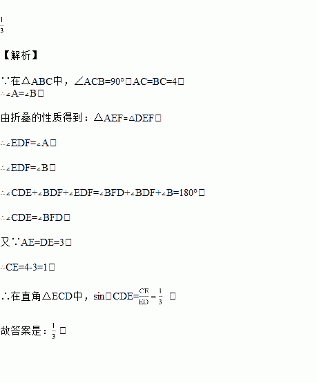 如图,在△ABC中,∠ACB=90°,AC=BC=4,将△ABC折叠,使点A落在BC边上的点D处,EF为折痕,若AE=3,则sin∠BFD的值为_______.