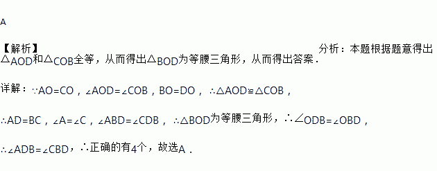 如图,已知AB、CD交于点O,AO=CO,BO=DO,则在以下结论中:①AD=BC;②∠A=∠C;③∠ADB=∠CBD;④∠ABD=∠CDB,正确结论的个数为( )