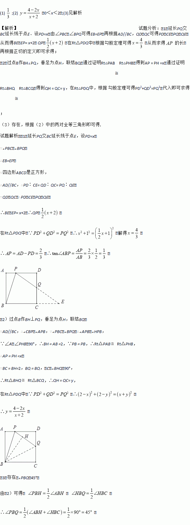 如图,在边长为2的正方形ABCD中,点P是边AD上的动点(点P不与点A、点D重合),点Q是边CD上一点,联结PB、PQ,且∠PBC=∠BPQ.
