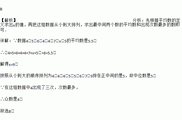 一组数据4,5,6,4,4,7, ,5的平均数是5.5,则该组数据的中位数和众数分别是( )