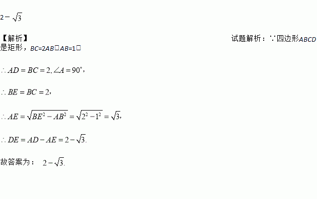 如图,在矩形ABCD中,BC=2AB.以点B为圆心,BC长为半径作弧交AD于点E,连接BE.若AB=1,则DE的长为________.
