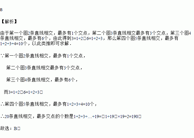 观察下列图形,第一个图2条直线相交最多有1个交点,第二个图3条直线相交最多有3个交点,第三个图4条直线相交最多有6个交点,…,像这样,则20条直线相交最多交点的个数是( )