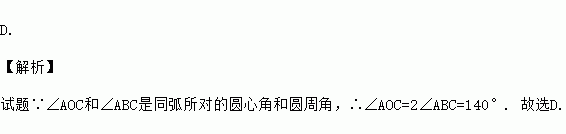 如图,△ABC是○O的内接三角形,若∠ABC=70°,则∠AOC的度数等于( )