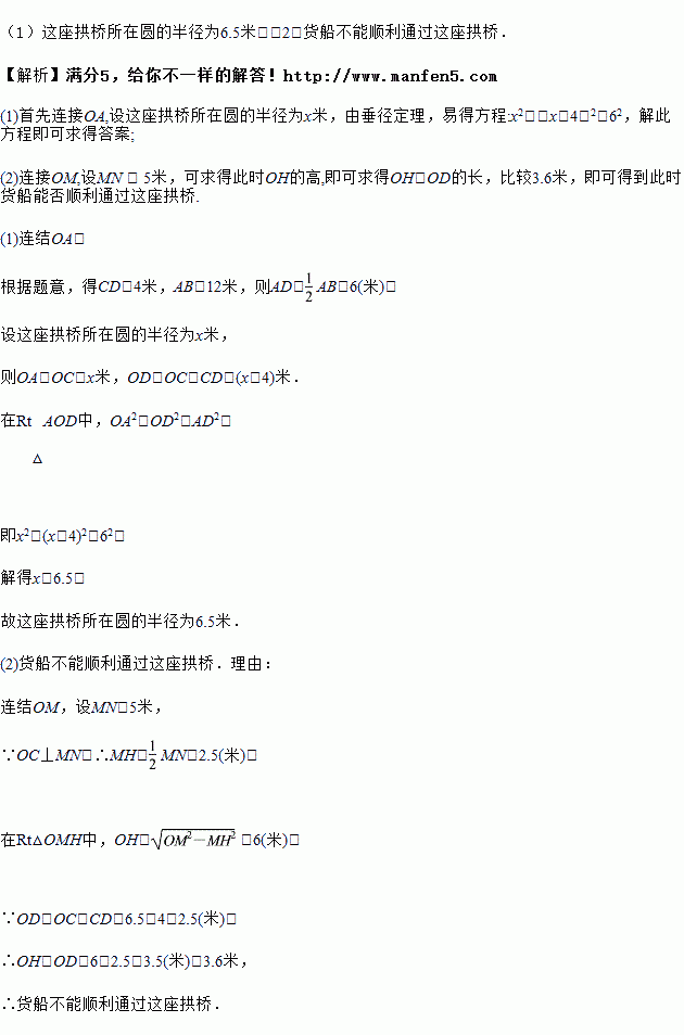 (2)现有一艘宽5米,船舱顶部为正方形并高出水面3.6米的货船要经过这里,此时货船能顺利通过这座拱桥吗?请说明理由.