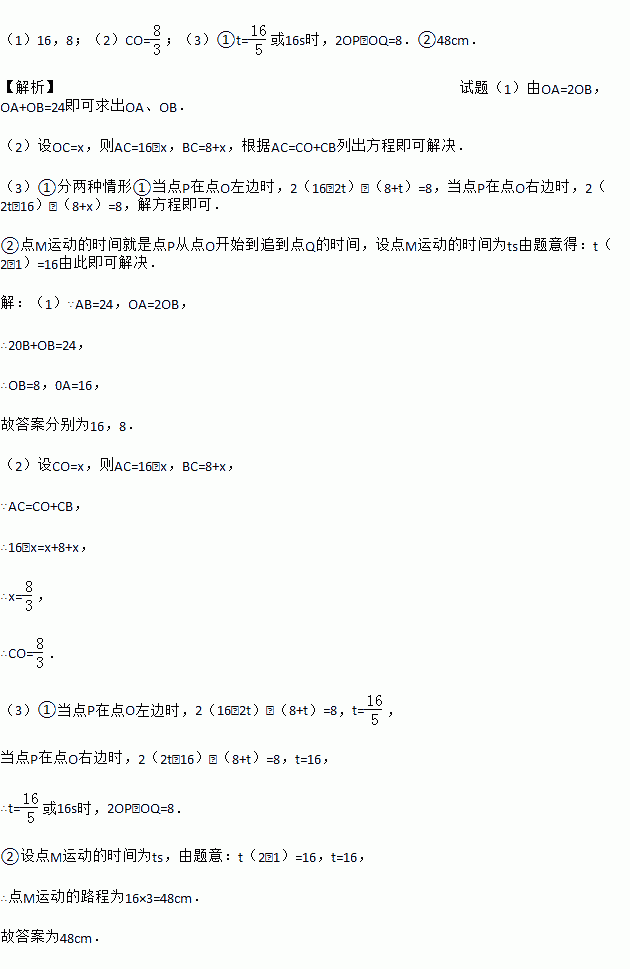 ②当点P经过点O时,动点M从点O出发,以3cm/s的速度也向右运动.当点M追上点Q后立即返回,以同样的速度向点P运动,遇到点P后立即返回,又以同样的速度向点Q运动,如此往返,直到点P、Q停止时,点M也停止运动.在此过程中,点M行驶的总路程为 cm.