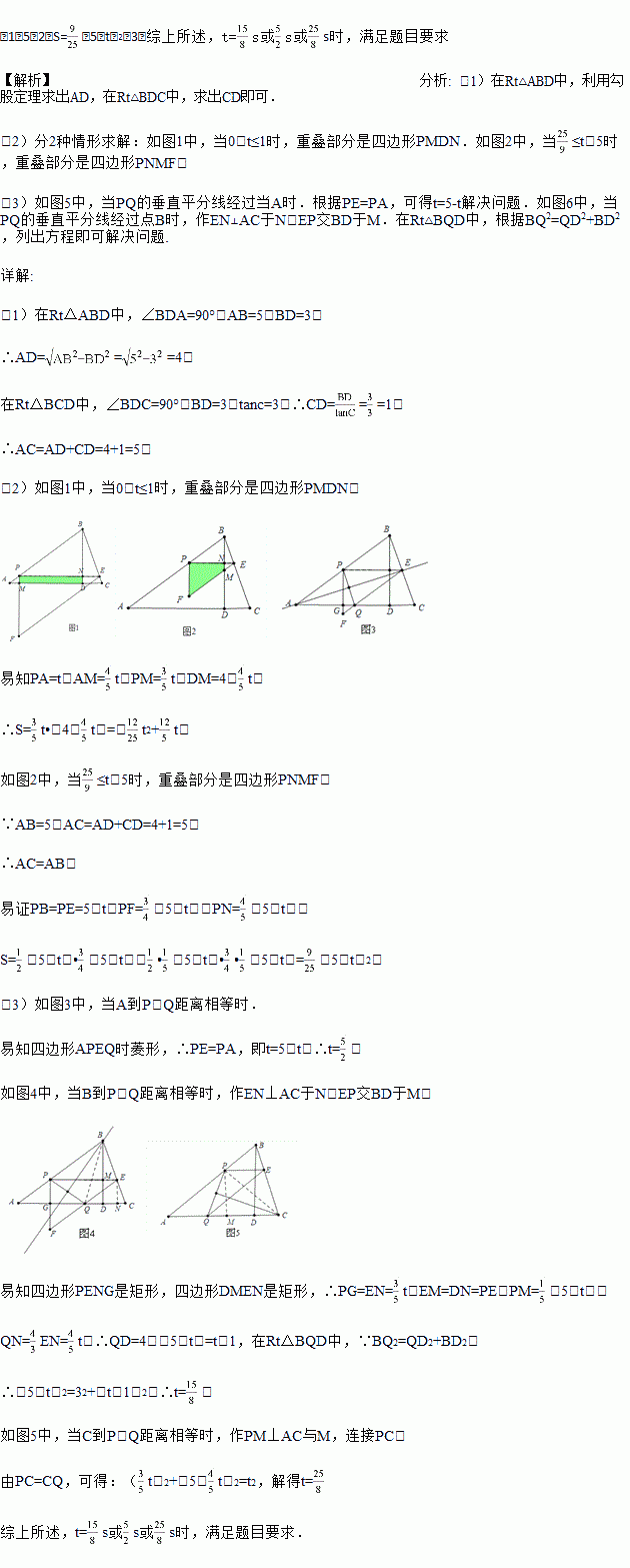 如图1,在锐角△ABC中,AB=5,tanC=3,BD⊥AC于点D,BD=3,点P从点A出发,以每秒1个单位长度的速度沿AB向终点B运动,过点P作PE∥AC交边BC于点E,以PE为边作Rt△PEF,使∠EPF=90°,点F在点P的下方,且EF∥AB.设△PEF与△ABD重叠部分图形的面积为S(平方单位)(S>0),点P的运动时间为t(秒)