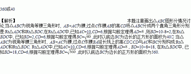 已知等腰三角形的腰长为10,一腰上的高为6,则以底边为边长的正方形的面积为_______.