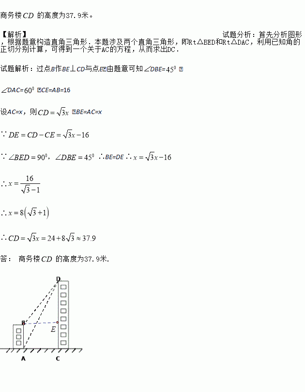 如图,一栋居民楼AB的高为16米,远处有一栋商务楼CD,小明在居民楼的楼底A处测得商务楼顶D处的仰角为