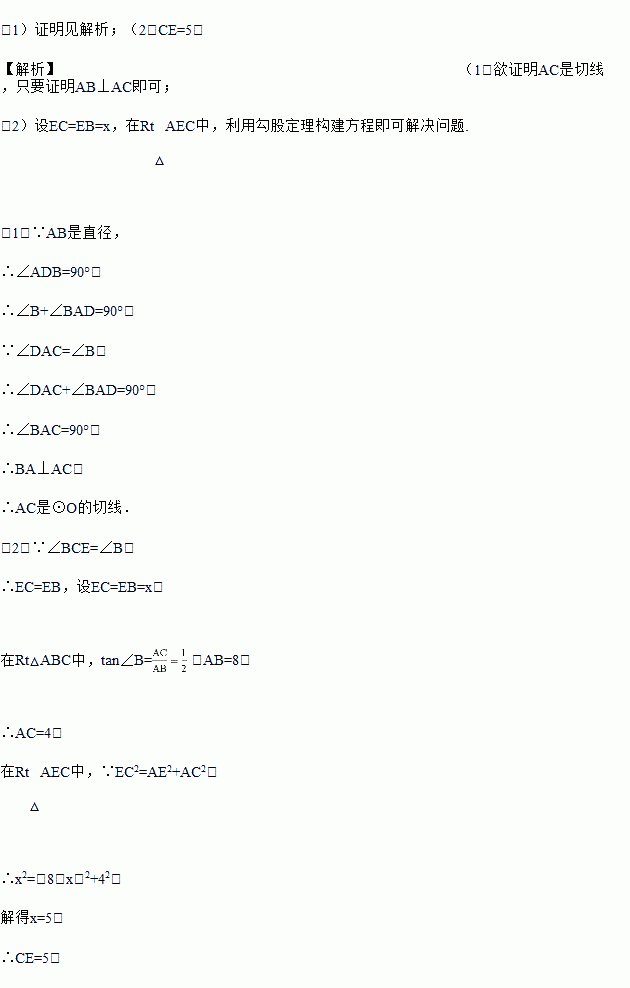 (2)点E是AB上一点,若∠BCE=∠B,tan∠B=,⊙O的半径是4,求EC的长.