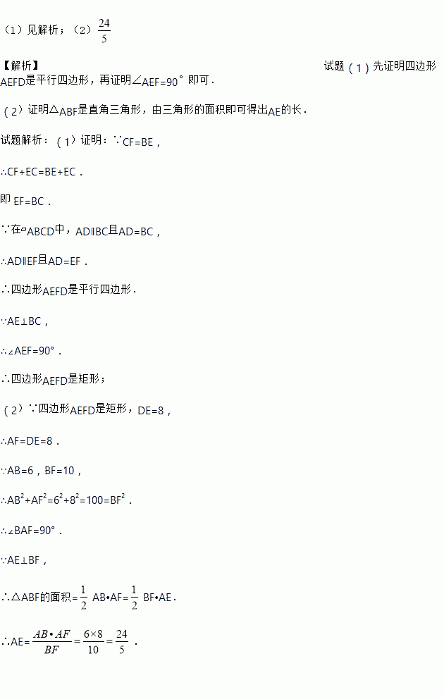 如图,在?ABCD中,AE⊥BC于点E,延长BC至点F使CF=BE,连结AF,DE,DF.