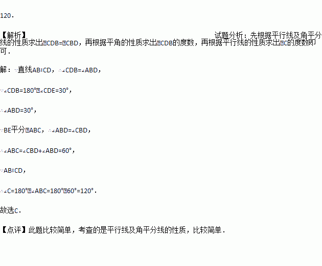 如图,已知直线AB∥CD,BE平分∠ABC,交CD于D,∠CDE=150°,则∠C的度数为______度.