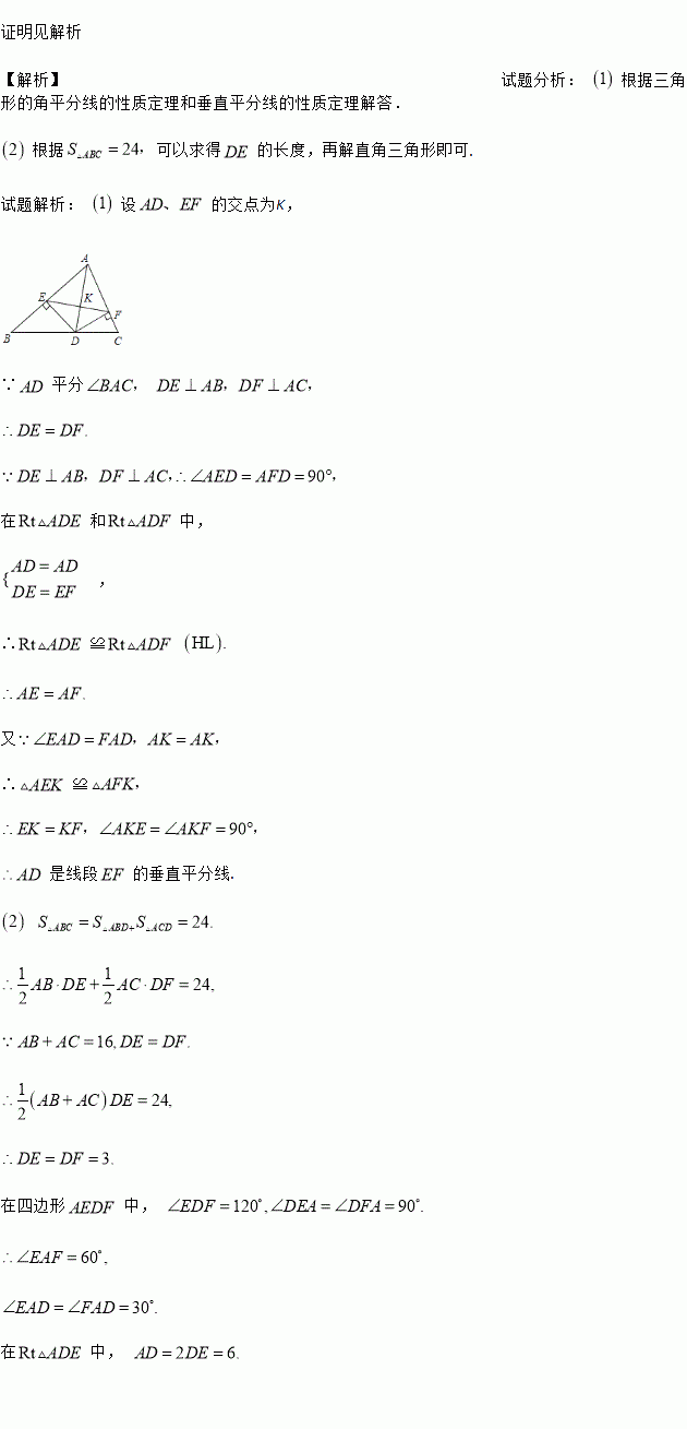 (2)若AB+AC=16,S△ABC=24,∠EDF=120°,求AD的长。