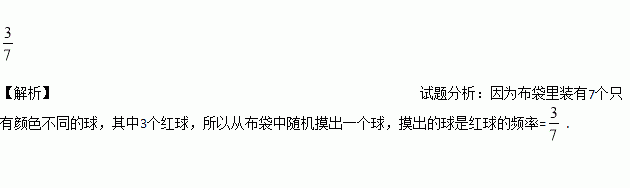 一个不透明的布袋里装有7个只有颜色不同的球,其中3个红球,4个白球,从布袋中随机摸出一个球,摸出的球是红球的概率是_______.