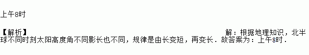 上午8时 【解析】【解析】 根据地理知识,北半球不同时刻太阳高度角不同影长也不同,规律是由长变短,再变长.故答案为:上午8时.