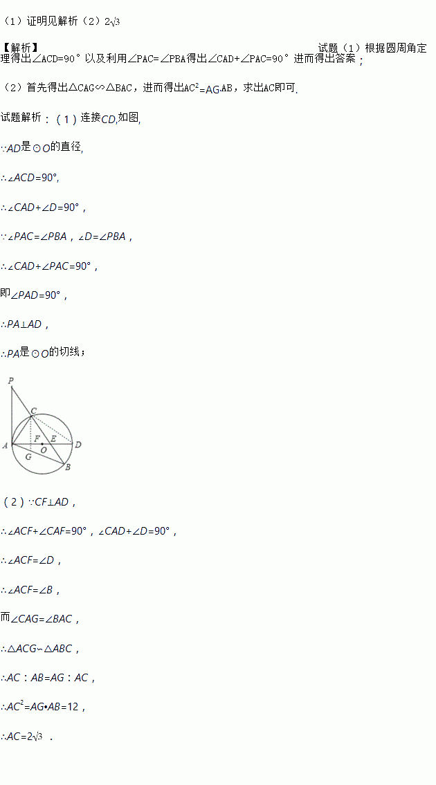 (2)过点C作CF⊥AD,垂足为点F,延长CF交AB于点G,若AG•AB=12,求AC的长.
