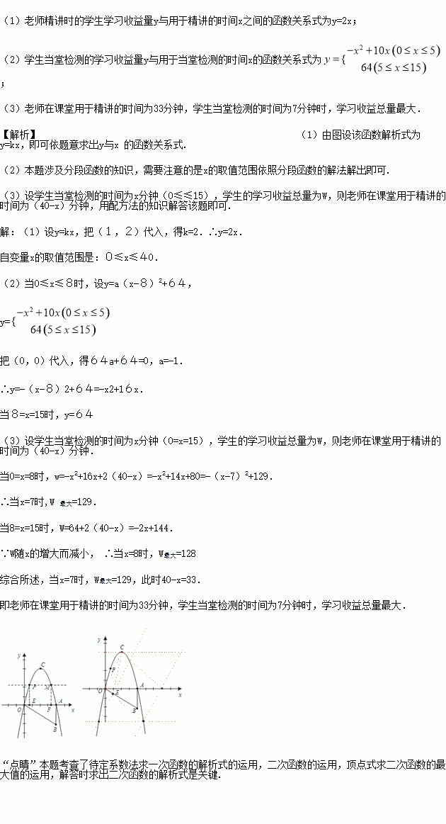 (1)求老师精讲时的学生学习收益量y与用于精讲的时间x之间的函数关系式;