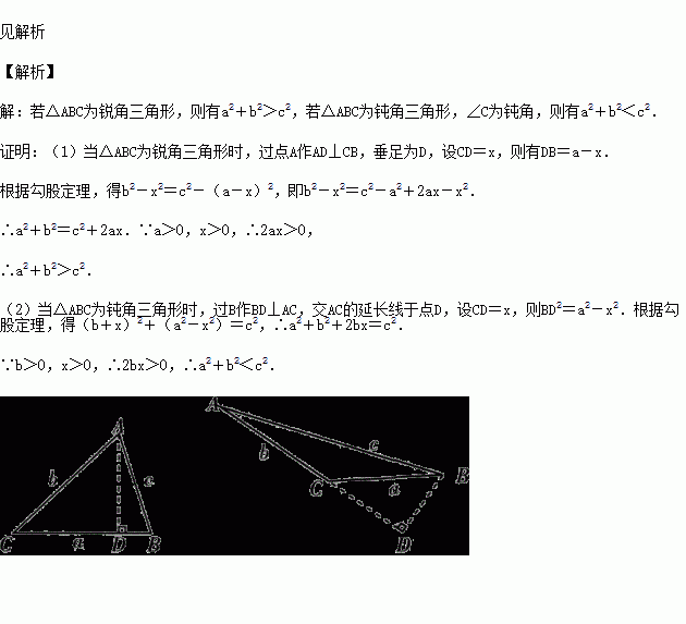 在△ABC中,BC=a,AC=b,AB=c,若∠C=90°,如图(1),则根据勾股定理,得a2+b2=c2.若△ABC不是直角三角形,如图(2)和(3),请你类比勾股定理,试猜想a2+b2与c2的关系,并证明你的结论.