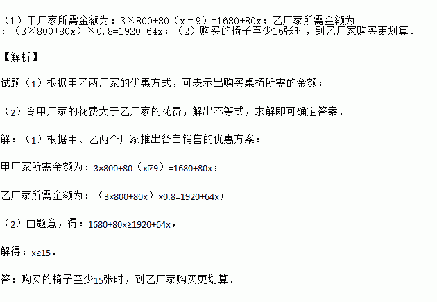 甲、乙两个厂家生产的办公桌和办公椅的质量、价格一致,每张办公桌800元,每张椅子80元.甲、乙两个厂家推出各自销售的优惠方案,甲厂家:买一张桌子送三张椅子;乙厂家:桌子和椅子全部按原价8折优惠.现某公司要购买3张办公桌和若干张椅子,若购买的椅子数为x张(x≥9).