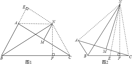 (2)如图2,若∠ABC=120°,则BA、BC、BN之间满足什么关系式,并对你得出的结论给予证明.
