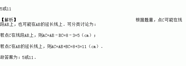 5或11 【解析】根据题意,点C可能在线段AB上,也可能在AB的延长线上.可分类讨论为: 若点C在线段AB上,则AC=AB﹣BC=8﹣3=5(cm); 若点C在AB的延长线上,则AC=AB+BC=8+3=11(cm). 故答案为:5或11.
