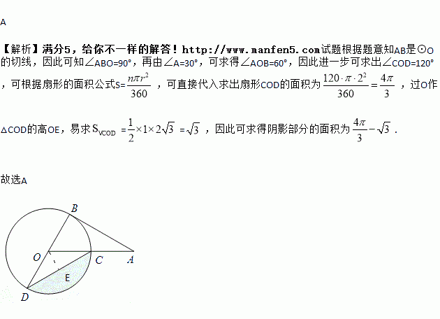 如图,AB为⊙O的切线,切点为B,连接AO,AO与⊙O交于点C,BD为⊙O的直径,连接CD.若∠A=30°,⊙O的半径为2,则图中阴影部分的面积为( )