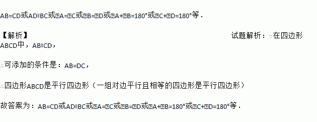 如图,在四边形ABCD中,AB∥CD,要使得四边形ABCD是平行四边形,应添加的条件是 .(只填写一个条件,不另外添加字母和线段)