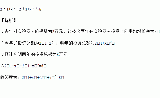某校去年投资2万元购买实验器材,预计今明2年的投资总额为8万元.若该校这两年购买的实验器材的投资年平均增长率为x,则可列方程为 .
