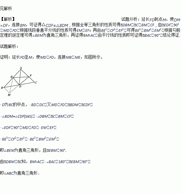 如图,△ABC中,AD是BC边上的中线,以D为顶点作∠EDF=90°,DE,DF分别交AB,AC于E,F,且BE2+CF2=EF2,求证:△ABC为直角三角形.