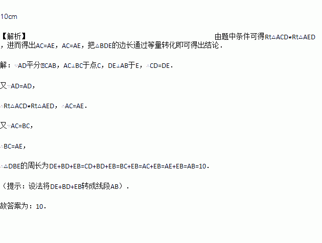如图,△ABC中,∠C=90°,AC=BC,AD是∠BAC的角平分线,DE⊥AB于E,若AB=10cm,则△DBE的周长等于_________.
