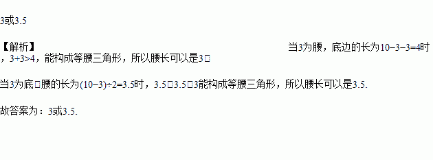 若等腰三角形的周长为10,一边长为3,则这个等腰三角形的腰长为_________