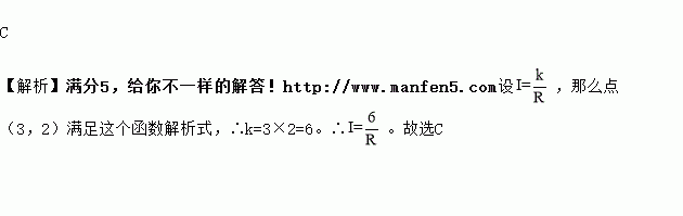 某闭合电路中,电源的电压为定值,电流I(A)与电阻R(Ω)成反比例.图表示的是该电路中电流I与电阻R之间函数关系的图象,则用电阻R表示电流I的函数解析式为【 】