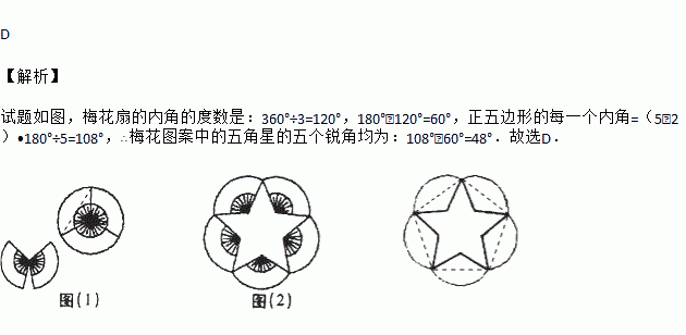 下图是由10把相同的折扇组成的“蝶恋花”(图1)和梅花图案(图2)(图中的折扇无重叠),则梅花图案中的五角星的五个锐角均为( )