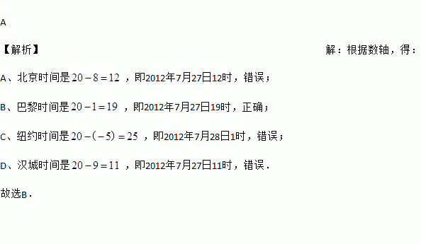 A 【解析】【解析】 根据数轴,得: A、北京时间是,即2012年7月27日12时,错误; B、巴黎时间是,即2012年7月27日19时,正确; C、纽约时间是,即2012年7月28日1时,错误; D、汉城时间是,即2012年7月27日11时,错误. 故选B.