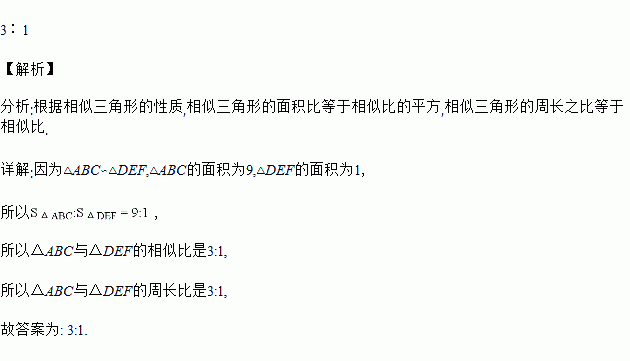 已知△ABC∽△DEF,△ABC的面积为9,△DEF的面积为1,则△ABC与△DEF的周长之比为________.
