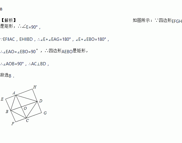 B 【解析】如图所示:∵四边形EFGH是矩形,∴∠E=90°, ∵EF∥AC,EH∥BD,∴∠E+∠EAG=180°,∠E+∠EBO=180°, ∴∠EAO=∠EBO=90°,∴四边形AEBO是矩形, ∴∠AOB=90°,∴AC⊥BD, 故选B.