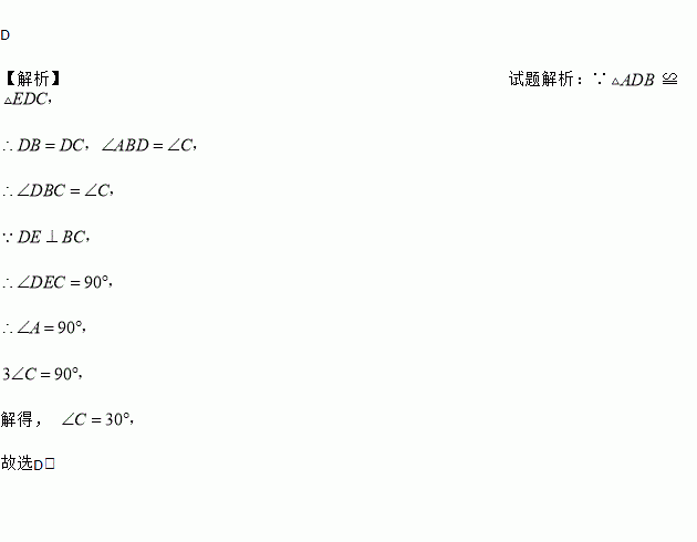 如图,在△ABC中,D,E分别是边AC和BC上的点,且DE⊥BC,若△ADB≌△EDC,则∠C=( )