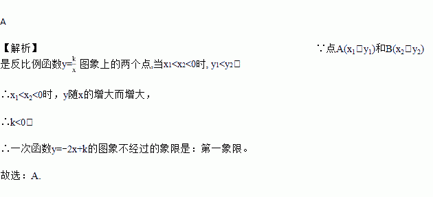的图像上的两个点,当x1<x2<0时,y1<y2,则一次函数y=-2x+k的图像不经过的象限是( )