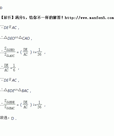 如图,D、E分别是△ABC的边AB、BC上的点,且DE∥AC, AE、CD相交于点O,若S△DOE:S△COA=1:36,则S△BDE与S△BAC的比是( )