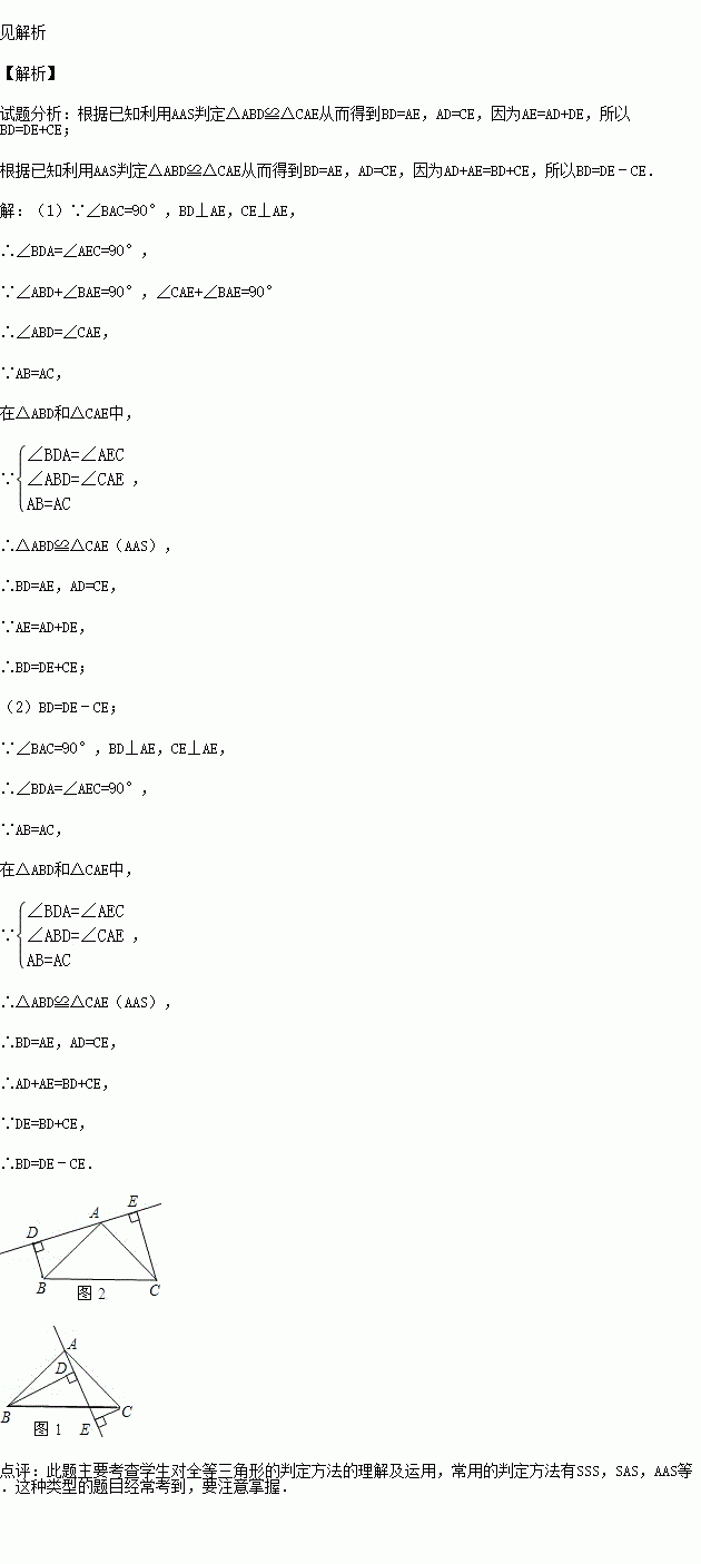 (1)如图1,△ABC中,∠BAC=90°,AB=AC,AE是过A点的一条直线,且B、C在AE的异侧,BD⊥AE于D,CE⊥AE于E,求证:BD=DE+CE.