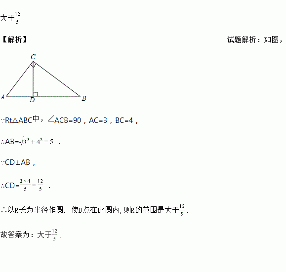 △ABC中,∠C=90°, AC=3 , BC=4 , CD交AB于D, 以点C为圆心, 以R长为半径作圆, 使D点在此圆内,则R的范围是______________.