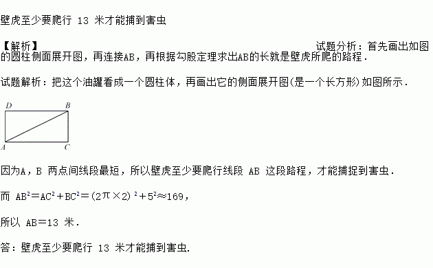 如图,壁虎在一座底面半径为 2 米,高为 5 米的油罐的下底边沿点 A处,它 发现在自己的正上方油罐上边缘的点 B处有一只害虫,便决定捕捉这只害虫,为了不引起害 虫的注意,它故意不走直线,而是绕着油罐,沿一条螺旋路线,从背后对害虫进行突然袭击.结 果,壁虎偷袭成功,获得了一顿美餐.请问壁虎至少要爬行多少路程 才能捕到害虫?(π取 3)